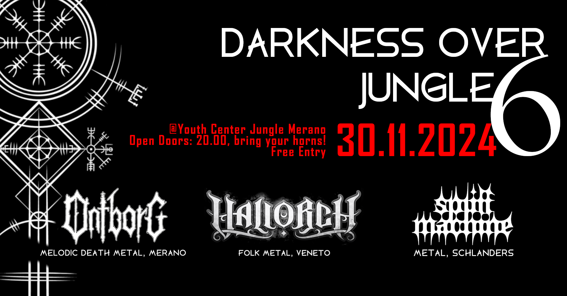 Am 30. November 2024 erklingen düstere Klänge im Jugendzentrum Jungle in Meran. Ab 20:00 Uhr erwartet dich bei der sechsten Ausgabe von Darkness Over Jungle ein Abend voller harter Riffs und energiegeladenem Metal. Drei Bands aus unterschiedlichen Metal-Subgenres heizen dir ordentlich ein. Der Eintritt ist frei!
