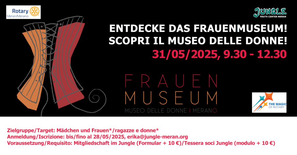 Komm mit uns am 31.05.2025 ins Frauenmuseum in Meran! Wir treffen uns um 9.30 Uhr im Jugendzentrum...