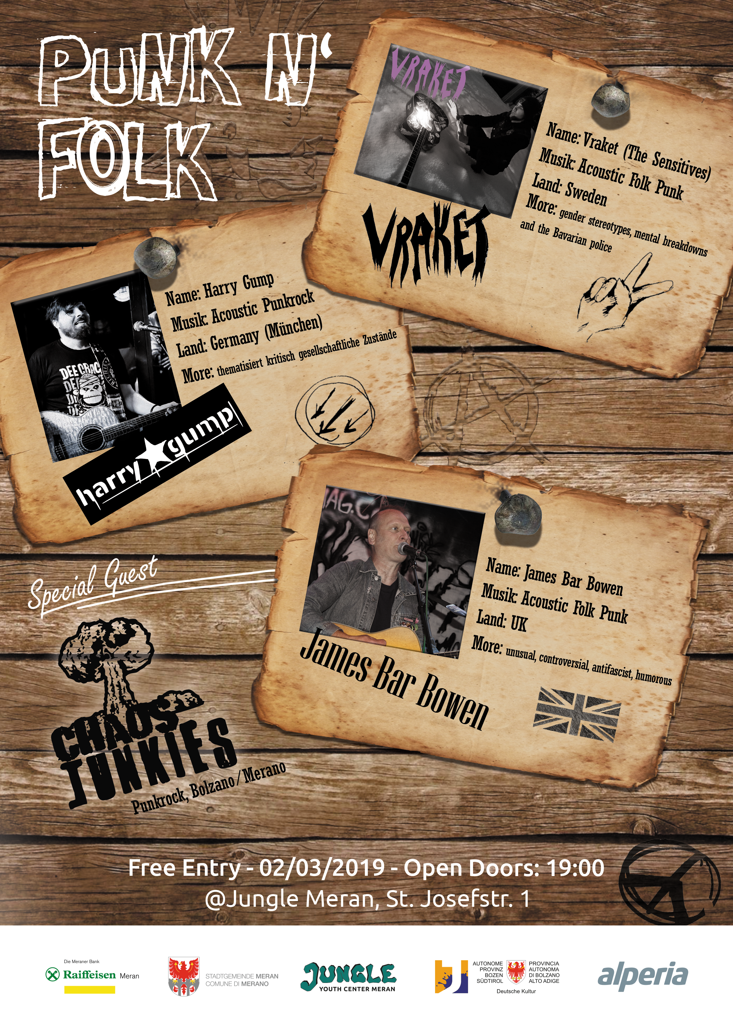 Am 02.03.2019 fand im Jungle ein Abend ganz im Zeichen des Punks statt. 3 Künstler aus dem Ausland und eine lokale Band, die Chaos Junkies, haben die guten alten Punkzeiten für diesen Abend wieder heraufbeschwört.