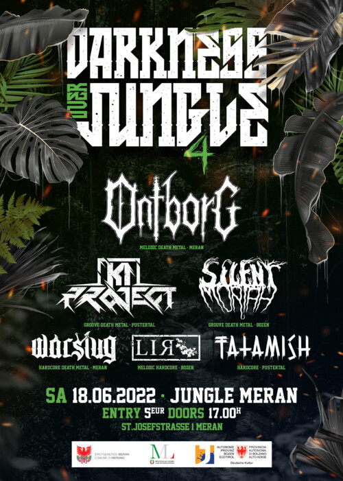 Dopo 2 anni di completa “pausa concerti”, la stagione concertistica del centro giovani Jungle riparte finalmente con un grande concerto metal! Dopo il successo della scorsa edizione (2018!), il concerto “Darkness Over Jungle” si svolgerà nella sua quarta edizione e dovrebbe, se le circostanze lo permettono, diventare un appuntamento fisso per i metallari di Merano e dintorni. Ecco perché quest’anno ci siamo impegnati molto, abbiamo messo insieme un forte line-up altoatesino e abbiamo fatto realizzare la grafica per l’evento da Daniel Hofer (Archetype Design)!